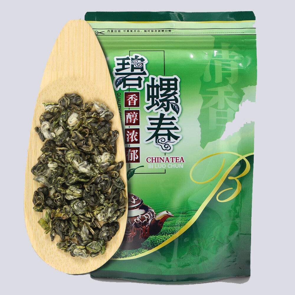Grade: B Tea Origin: Jiangsu, China Store Conditions: Cool and ventilated place, avoid direct sunlight. Tea leaves (Dried): Curled like a snail, covered with velvet, silvery green and emerald. Aroma: Fragrance and elegance. Infusion: Strong mellow, refreshing and refreshing, long aftertaste. Biluochun is picked so early in the spring the dry tea leaves are coated in small white 'hairs', which is customary for high end Bi Luo Chun, the fuzzy and very small leaves are characteristic for this tea. There are machines that can remove or reduce the fuzzy hair of the leaves, however traditional Bi Luo Chun contains no such method. Biluochun is a tea best enjoyed as early as possible in China, to experience the freshness of the tea with the unique characteristics and aroma the blossoming fruit trees provide.