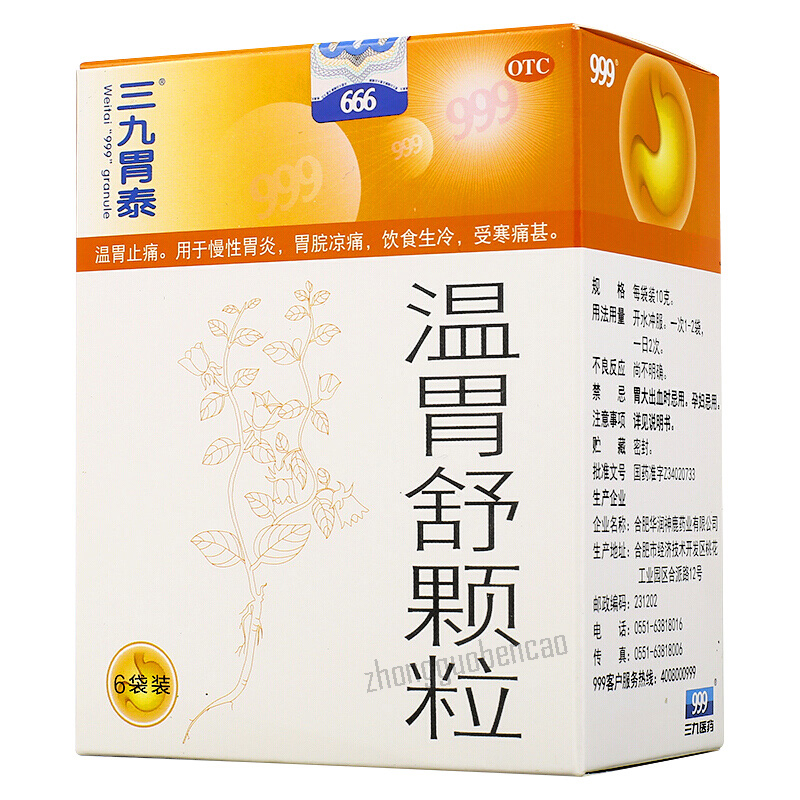 三九胃泰温胃舒颗粒 每盒6袋 1盒装 保质期36个月 Item: Sanjiu Weitai Wenweishu Keli Weight/Bag: 10g Quantity/Box: 6 Bags Shelf Life: 36 Months Package Included: 1 Box of 999 Wenweishu Keli |