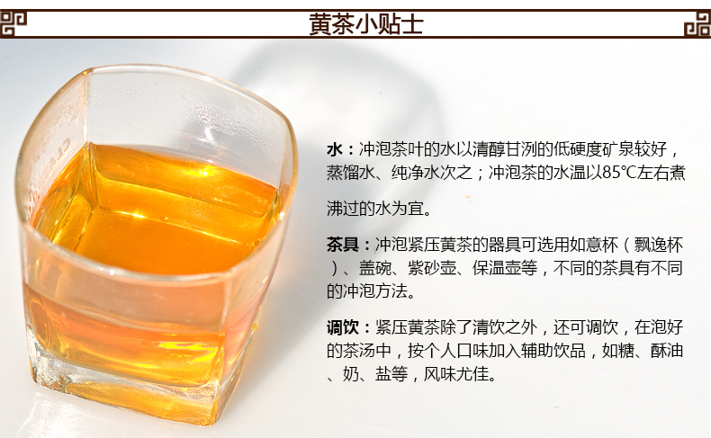 Net Weight:30g (5g x 6 pcs) Packaging:Box Origin:China Jun Shan Huang Cha tea is a yellow tea from Junshan Island of the Hunan Province in China. It is one of Chinese Famous Teas. Junshan yellow tea is only produce using the tea leaves from the tea garden at the Junshan Island, which is located in the middle of Dong Ting Lake of Hunan Province. The best quality Jun Shan tea is called as Jun Shan Yin Zhen. The production of Jun Shan Yin Zhen demands that tea pickers pluck only buds while the golden brick is made with the material picked as one bud and one leaf system. Jun Shan yellow tea is processed similarly to green tea, but after the first firing it undergoes steaming followed by a prolonged “resting” wrapped in cloth or paper. This stage called men huan may last a day or two before the final firing. The moist pause allows the leaves to breathe back their own aromas and prevents the astringency associated with some green teas. It also gives the leaves a very slight yellow cast. The initial firing halts most of the oxidation, but similar to white tea it is very slightly oxidized.As a result, it produces bright yellow color, refreshing flavor and sweet and mellow taste that are the characteristics of yellow tea. Jun Shan Huang Cha is less expensive than Jun Shan Yin Zhen needle tea, first grade leaves harvested from the same area, followed by traditional process, you can try the famouse yellow tea at an affordable price. An authentic product from Hunan Junshan Yinzhen Tea Co., Ltd. Brewing Guide: Use each cake for 200ml of water. Quickly rinse the tea leaves with hot water at 80 degree Celsius, and then gently pour hot water at 80-85 degree C into the teapot, let it brew for 2 minutes. The leaves are good for 5 infusions. Add a little more time for each subsequent infusion. |